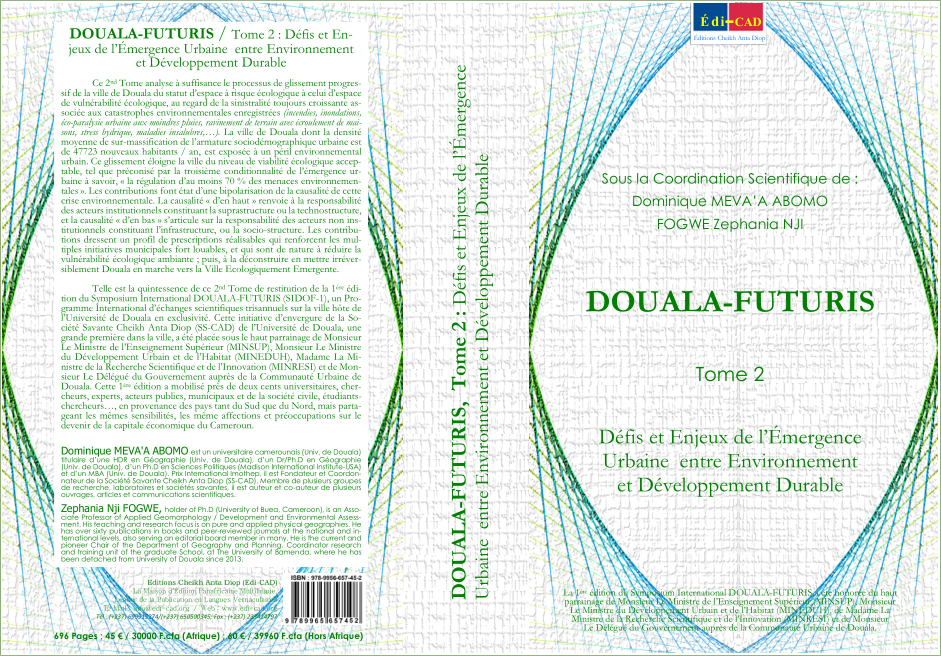 Telle est la quintessence de ce 2nd Tome de restitution de la 1ère édition du Symposium International DOUALA-FUTURIS (SIDOF-1), un Programme International d’échanges scientifiques trisannuels sur la ville hôte de l’Université de Douala en exclusivité. Cette initiative d’envergure de la Société Savante Cheikh Anta Diop (SS-CAD) de l’Université de Douala, une grande première dans la ville, a été placée sous le haut parrainage de Monsieur Le Ministre de l’Enseignement Supérieur (MINSUP), Monsieur Le Ministre du Développement Urbain et de l’Habitat (MINEDUH), Madame La Ministre de la Recherche Scientifique et de l’Innovation (MINRESI) et de Monsieur Le Délégué du Gouvernement auprès de la Communauté Urbaine de Douala. Cette 1ère édition a mobilisé près de deux cents universitaires, chercheurs, experts, acteurs publics, municipaux et de la société civile, étudiants-chercheurs…, en provenance des pays tant du Sud que du Nord, mais partageant les mêmes sensibilités, les même affections et préoccupations sur le devenir de la capitale économique du Cameroun.