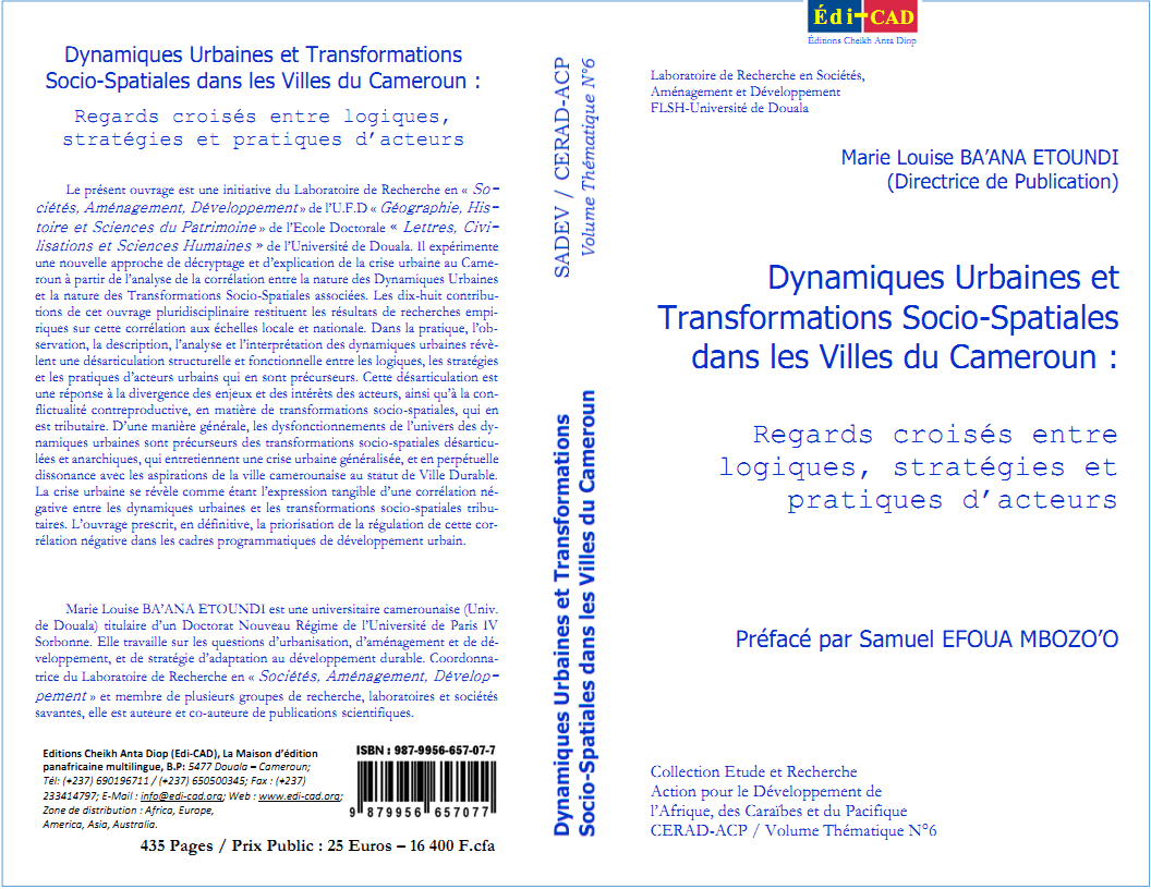 Le présent ouvrage est une initiative du Laboratoire de Recherche en « Sociétés, Aménagement, Développement » de l’U.F.D « Géographie, Histoire et Sciences du Patrimoine » de l’Ecole Doctorale « Lettres, Civilisations et Sciences Humaines » de l’Université de Douala. Il expérimente une nouvelle approche de décryptage et d’explication de la crise urbaine au Cameroun à partir de l’analyse de la corrélation entre la nature des Dynamiques Urbaines et la nature des Transformations Socio-Spatiales associées. Les dix-huit contributions de cet ouvrage pluridisciplinaire restituent les résultats de recherches empiriques sur cette corrélation aux échelles locale et nationale. Dans la pratique, l’observation, la description, l’analyse et l’interprétation des dynamiques urbaines révèlent une désarticulation structurelle et fonctionnelle entre les logiques, les stratégies et les pratiques d’acteurs urbains qui en sont précurseurs. Cette désarticulation est une réponse à la divergence des enjeux et des intérêts des acteurs, ainsi qu’à la conflictualité contreproductive, en matière de transformations socio-spatiales, qui en est tributaire. D’une manière générale, les dysfonctionnements de l’univers des dynamiques urbaines sont précurseurs des transformations socio-spatiales désarticulées et anarchiques, qui entretiennent une crise urbaine généralisée, et en perpétuelle dissonance avec les aspirations de la ville camerounaise au statut de Ville Durable. La crise urbaine se révèle comme étant l’expression tangible d’une corrélation négative entre les dynamiques urbaines et les transformations socio-spatiales tributaires. L’ouvrage prescrit, en définitive, la priorisation de la régulation de cette corrélation négative dans les cadres programmatiques de développement urbain.