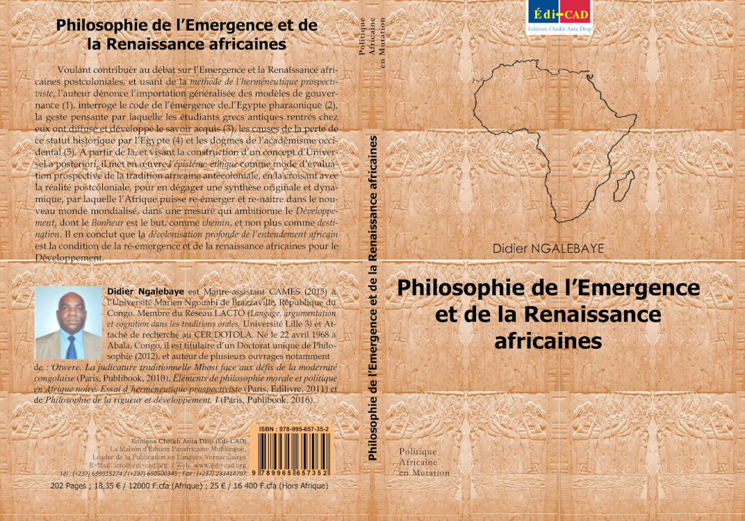 Didier Ngalebaye est Maitre-assistant CAMES (2015) à l’Université Marien Ngouabi de Brazzaville, République du Congo. Membre du Réseau LACTO (Langage, argumentation et cognition dans les traditions orales, Université Lille 3) et Attaché de recherche au CER DOTOLA. Né le 22 avril 1968 à Abala, Congo, il est titulaire d’un Doctorat unique de Philosophie (2012), et auteur de plusieurs ouvrages notamment de : Otwere. La judicature traditionnelle Mbosi face aux défis de la modernité congolaise (Paris, Publibook, 2010), Eléments de philosophie morale et politique en Afrique noire. Essai d’herméneutique prospectiviste (Paris, Edilivre, 2011) et de Philosophie de la rigueur et développement, I (Paris, Publibook, 2016).